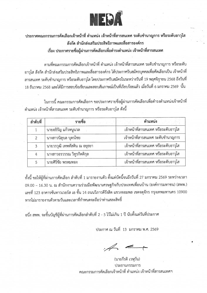 ประกาศรายชื่อผู้ผ่านการคัดเลือกเพื่อดำรงตำแหน่ง เจ้าหน้าที่สารสนเทศ