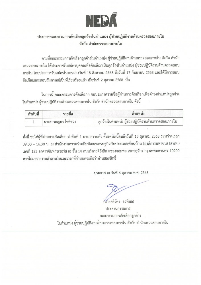 ประกาศรายชื่อผู้ผ่านการคัดเลือกเพื่อเป็นลูกจ้างในตำแหน่ง ผู้ช่วยปฏิบัติงานด้านตรวจสอบภายใน