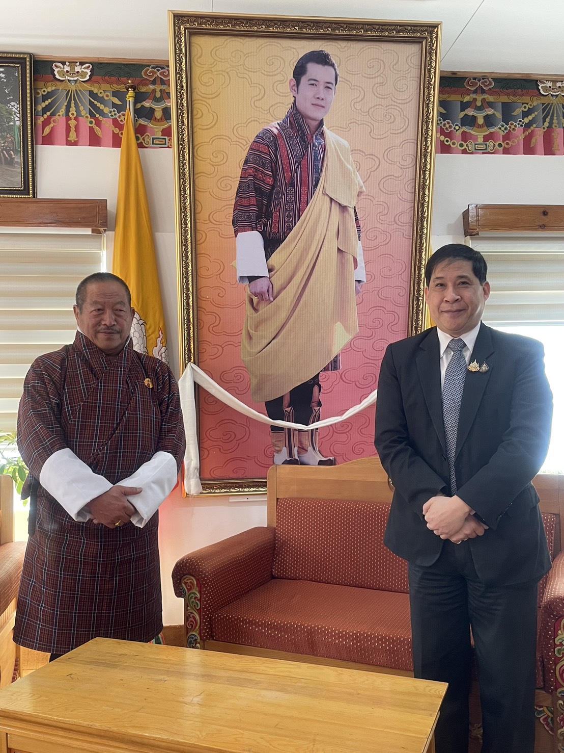 เมื่อวันที่ 28 มกราคม 2569 พันเอก ศรัณยู วิริยเวชกุล รองผู้อำนวยการสำนักงานความร่วมมือพัฒนาเศรษฐกิจกับประเทศเพื่อนบ้าน (องค์การมหาชน) (สพพ.) พร้อมคณะผู้แทน เข้าเยี่ยมคารวะ H.E. Mr. Gem Tshering รัฐมนตรีว่าการกระทรวงพลังงานและทรัพยากรธรรมชาติ โดยหารือความเป็นไปได้ในการสร้างความร่วมมือทางการเงินและวิชาการระหว่าง สพพ. กับภูฏาน โดยเฉพาะอย่างยิ่งความร่วมมือเชิงกลยุทธ์และโอกาสของ สพพ. ในการร่วมมือพัฒนาเทคโนโลยีเพื่อสิ่งแวดล้อมและพลังงานสีเขียว (Environment and Green Technology) โดยมีเป้าหมายเพื่อลดผลกระทบเชิงลบต่อธรรมชาติและปกป้องฟื้นฟูสิ่งแวดล้อมอย่างยั่งยืน ในโอกาสนี้ สพพ. ได้ให้ข้อมูลหลักการและเงื่อนไขการให้ความช่วยเหลือของ สพพ. เพื่อประโยชน์ในการสร้างความร่วมมือสำหรับราชอาณาจักรภูฏานต่อไป ณ กระทรวงพลังงานและทรัพยากรธรรมชาติ กรุงทิมพู ราชอาณาจักรภูฏาน