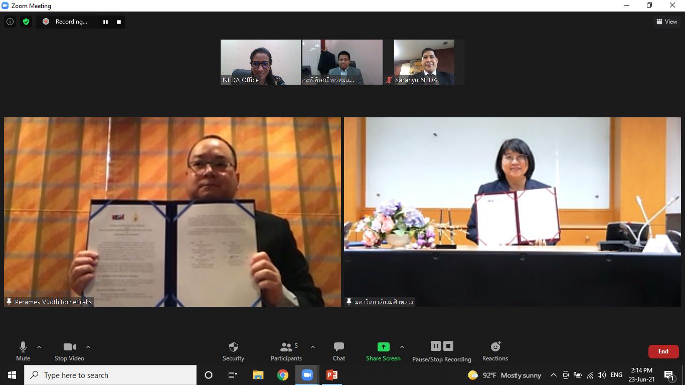 เมื่อวันที่ 23 มิถุนายน 2564 สำนักงานความร่วมมือพัฒนาเศรษฐกิจกับประเทศเพื่อนบ้าน (องค์การมหาชน) (สพพ.) กับ สำนักวิชาการจัดการมหาวิทยาลัยแม่ฟ้าหลวง (มฟล.) ได้จัดพิธีลงนามบันทึกข้อตกลงความร่วมมือในรูปแบบ online (Virtual Signing) โดยมีนายพีรเมศร์ วุฒิธรเนติรักษ์ ผู้อำนวยการ สพพ. เป็นผู้ลงนาม ร่วมกับ ดร. ฉัตรฤดี จองสุรียภาส ผู้ช่วยอธิการบดีและคณบดี สำนักวิชาการจัดการ มฟล. พร้อมด้วยผู้แทนจากทั้ง สพพ. และ มฟล. ร่วมเป็นสักขีพยาน การลงนามในบันทึกข้อตกลงฉบับดังกล่าวเป็นการดำเนินงานตามยุทธศาสตร์ระยะ 20 ปี ของ สพพ. (พ.ศ. 2563-2582) ภายใต้ยุทธศาสตร์การพัฒนาองค์ความรู้ด้านการพัฒนาระหว่างประเทศ (Think Tank) โดยการสร้างเครือข่ายงานวิจัยเชิงนโยบายร่วมกับหน่วยงานภายในประเทศและต่างประเทศทั้งภาครัฐและภาคเอกชน สำหรับการพัฒนาเศรษฐกิจในอนุภูมิภาคลุ่มน้ำโขง เพื่อเป็นคลังความรู้และแหล่งข้อมูลเชิงลึกทั้งข้อมูลด้านปฐมภูมิและทุติยภูมิที่สำคัญ และนำไปประยุกต์ใช้ต่อยอดการปฏิบัติงานตามภารกิจหลักของ สพพ. ในอนาคตต่อไป
